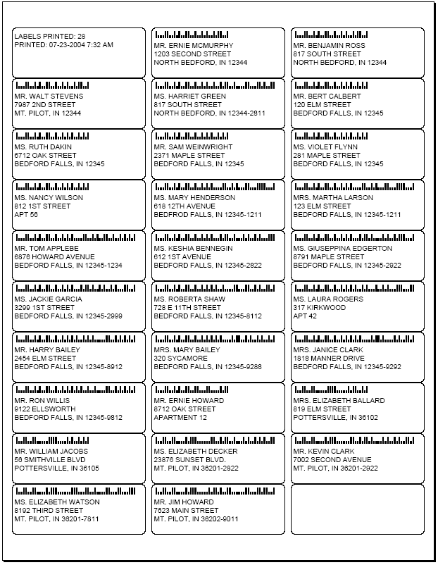 This stock reports generates labels optimized for large mailings that must conform to postal service bulk mail regulations: