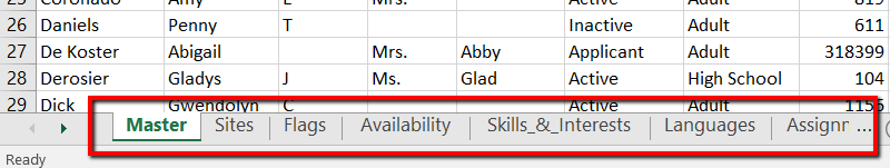 The Master worksheet always contains the volunteer's core information such as their name and address. If your spreadsheet only includes this kind of core information, no additional worksheets appear. If your spreadsheet includes fields for any of the following kinds of records, you'll have a separate worksheet for each: