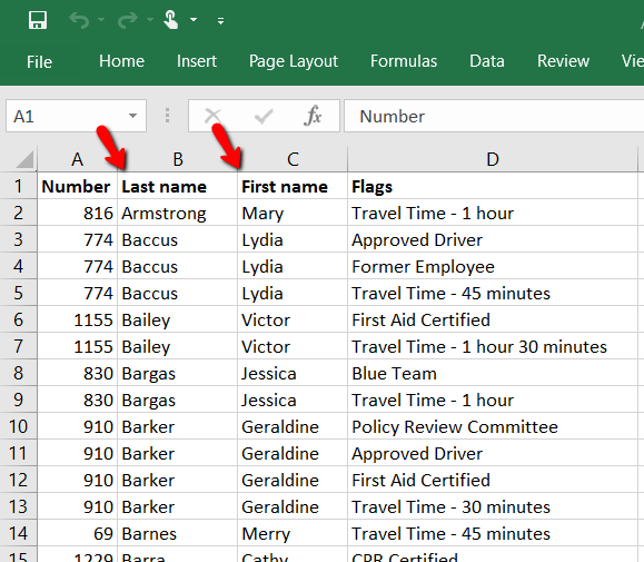 Spreadsheet files store information in rows and columns. The spreadsheet files you create using the Excel spreadsheet report have a row for each volunteer record and one column for each field you include. The spreadsheet shown below is an example. Each row contains the record for a different volunteer, and each column contains a different field. The first column contains the volunteer's Last name, the second column their First name, and so forth.