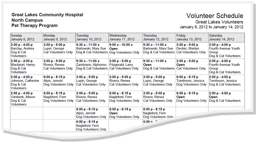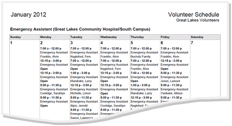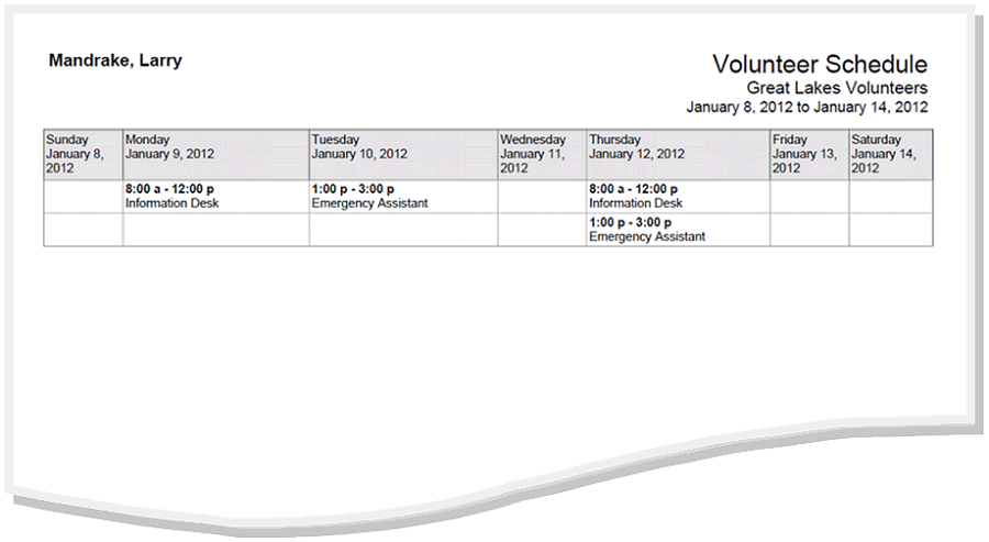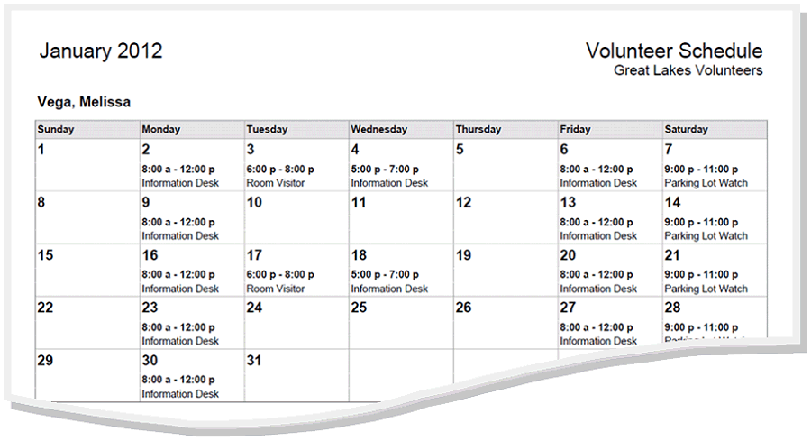 Schedule reports provide a way to list the schedules for your organization. These reports are useful to post at a volunteer location or to give to individual volunteers and/or Coordinators. You can also create sign-in sheets with these reports to help keep track of when volunteers serve.