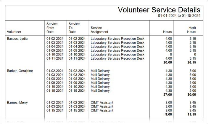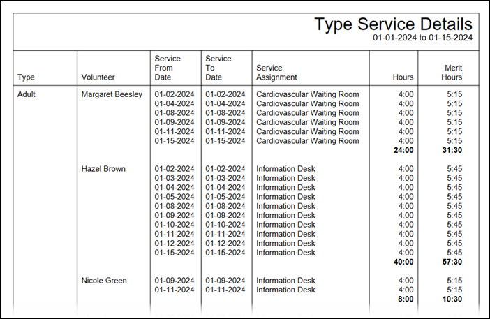 Service Details reports list the individual service records for the volunteers and time period you choose. These reports are useful for comparing database entries to external service information like time sheets, or seeing the individual dates volunteers served. Service Detail reports can include: