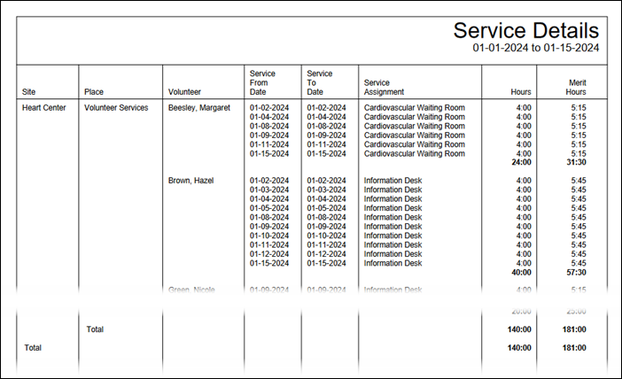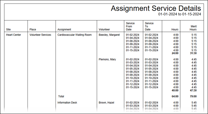 You can choose to list individual service entries for volunteers, just the totals for each volunteer, or just the subtotals for each Site, Place, Assignment, Type, or date.