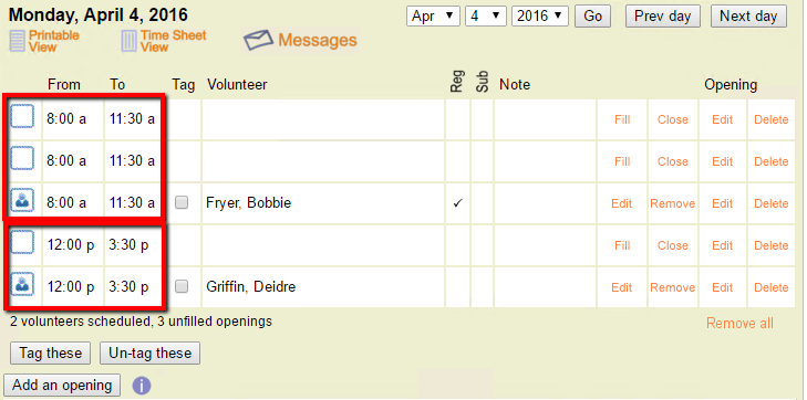 When you're working with openings, keep in mind that schedule entries are independent of openings. A volunteer can be filling an opening, but not be scheduled for the same start and stop times as the opening.