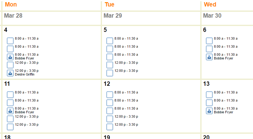 Openings can be setup to take place on one day only (one-time), or they can be setup to repeat in a pattern (ongoing). An example of an ongoing opening is one that repeats every Monday, Tuesday, and Wednesday. On the monthly view of the schedule pictured below, the 8:00 am to 11:30 am opening repeats on Mondays, Tuesdays, and Wednesdays, and the 12:00 pm to 3:30 pm opening repeats on Mondays and Tuesdays.