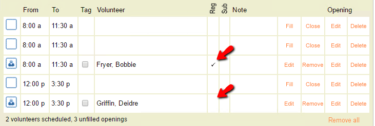 Volunteers can be scheduled to fill an opening for one day only, or on a repeating basis such as every Monday and Wednesday. If a volunteer is scheduled on an ongoing (repeating) basis, the daily schedule will indicate this with a checkmark in the Reg column. In the example pictured below, Bobbie Fryer is scheduled on a repeating basis, and Deidre Griffin is only scheduled for one day.