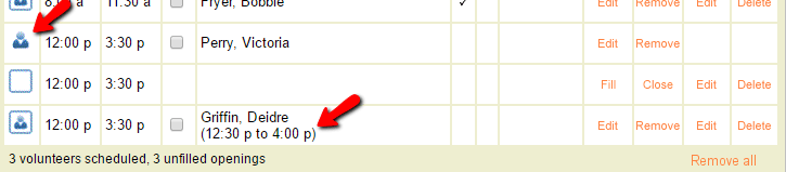 Deidre Griffin has been placed on the schedule as filling an opening. By default, her schedule entry had the same start and stop times as the opening. However, either her schedule entry was edited to have different start and stop times, or the opening's times were edited to be different than the volunteer's scheduled times. The schedule entry is still associated with the opening though. It's easy to tell because the schedule icon shows a figure with a box around it.