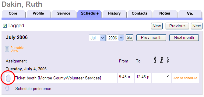 The volunteer's schedule preferences (as indicated on their volunteer application form) appear with the raised hand icon, as shown here: