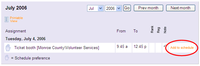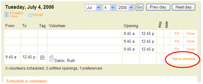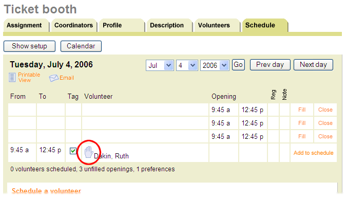In the example pictured above, volunteer 'Ruth Dakin' indicated that she was interested in serving in the Ticket booth assignment for the 9:45 a.m. to 12:45 p.m. opening on July 4, 2006.