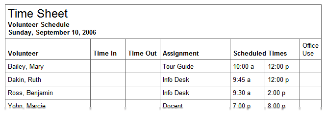 Volunteers can use time sheets to sign-in and out when they arrive and depart, and you can use them when you post hours from the schedule to confirm each volunteer's service.