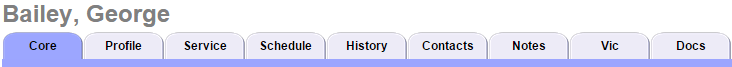 Volgistics helps you keep your volunteer information organized by arranging it onto nine different tabs in the volunteer record. Each tab includes a specific kind of volunteer information. For example, the Service tab includes the volunteer's current and past service information.