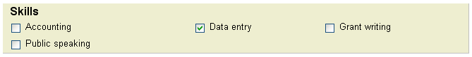 If you have chosen to track the field in both volunteer and Assignment records, the same Skills box will also appear in each volunteer record. Indicate that a volunteer has specific skills by marking the relevant boxes in his or her record.
