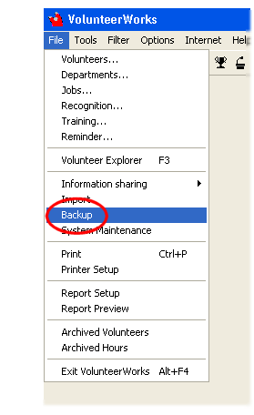 Select the File menu in VolunteerWorks and then choose Backup.