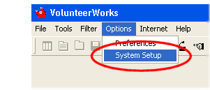 Select the Options menu in VolunteerWorks and then choose System setup.
