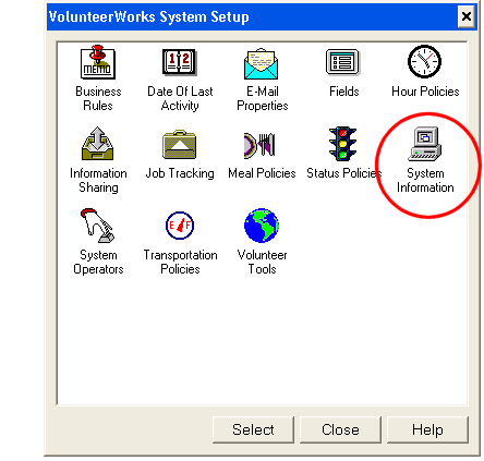 Double click System Information in the VolunteerWorks System Setup dialog box.