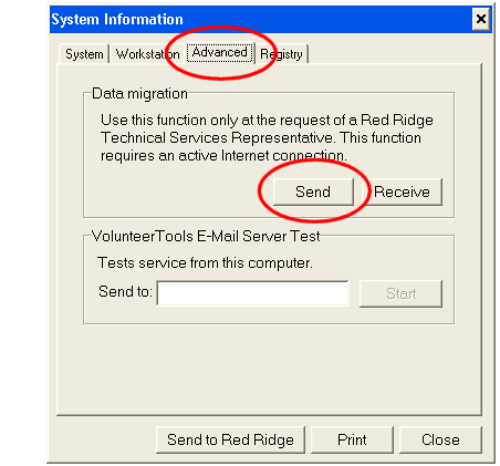 In the System Information dialog box, select the Advanced tab and then click the Send button under Data migration. (If your System Information box does not include a Data migration box, close VolunteerWorks and follow the instructions in the Upload your data from your web browser section below.)
