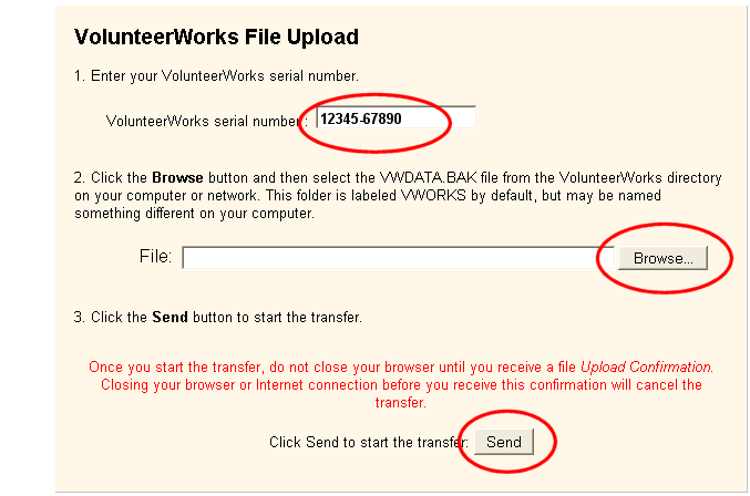 Enter your VolunteerWorks license (serial) number in the VolunteerWorks file upload box as shown below. Step 1 in the Make a backup in VolunteerWorks section above shows how to find your serial number.