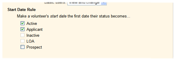 By default, the 'Active' status is the only volunteer status that start dates are based on. If you want volunteer start dates to be based on a status other than (or in addition to) the 'Active' status, check the appropriate status checkbox (or boxes) here. For example, if you have a volunteer status called 'Applicant,' and you want your volunteer start dates to be based on the first date a volunteer's status becomes either 'Applicant' or 'Active,' check both the 'Active' and the 'Applicant' statuses, as shown in this illustration: