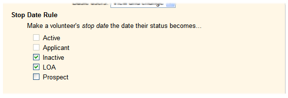 Status checkboxes that appear disabled here cannot be used as the basis for stop dates because they are statuses currently used to trigger volunteer start dates.
