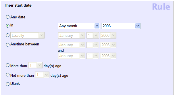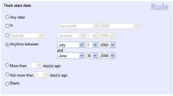 Configure the set rule as shown above. Choose the starting and ending dates you're interested in, as shown. The Set rule in the example shown above finds all of the volunteers who have a start date between July 1, 2005 and June 30, 2006.